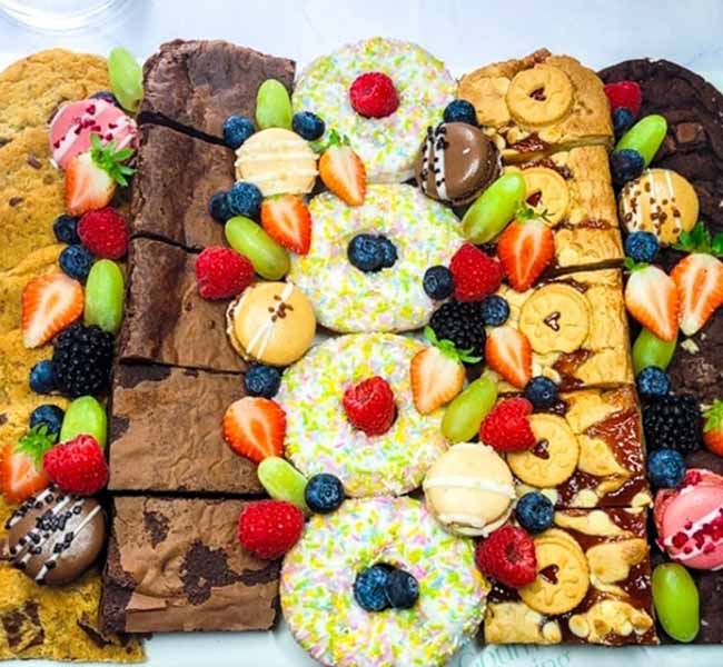 Dive into a delectable assortment featuring rich chocolate brownies, buttery blondies, chewy cookies, fluffy doughnuts, delicate macarons, and a colourful array of fresh, juicy fruits. Perfect for satisfying every sweet craving and adding a touch of elegance to any occasion.