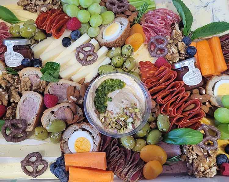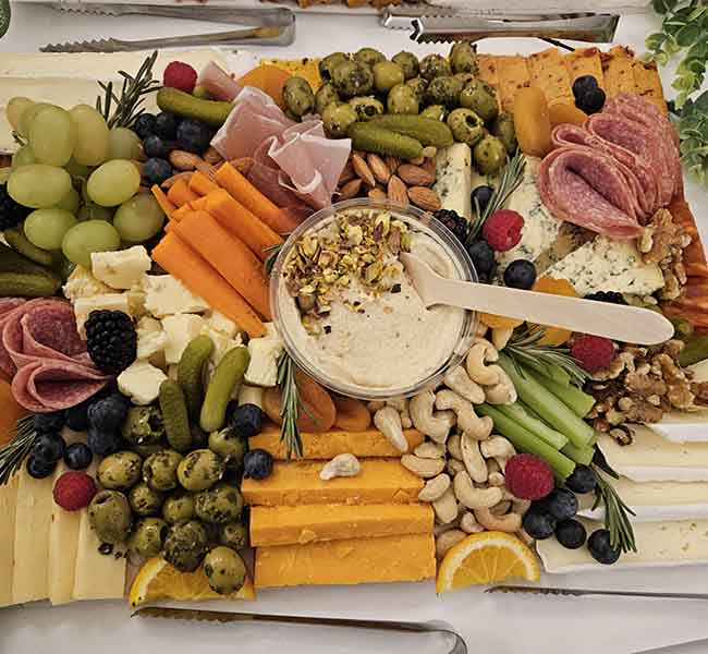 The perfect array of artisanal cheeses, succulent charcuterie, creamy humous, vibrant fruit, tangy olives and crunchy nuts, all arranged perfectly.