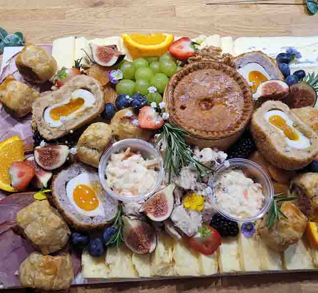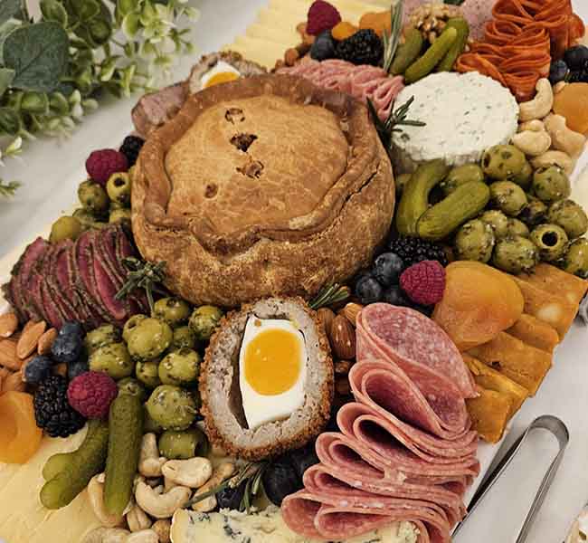 Selection of artisanal cheeses, succulent charcuterie, velvety pate, savoury pork pies, a lusciously runny yolk scotch egg, smooth humous complemented by delicious olives, crunchy nuts & vibrant fruits.